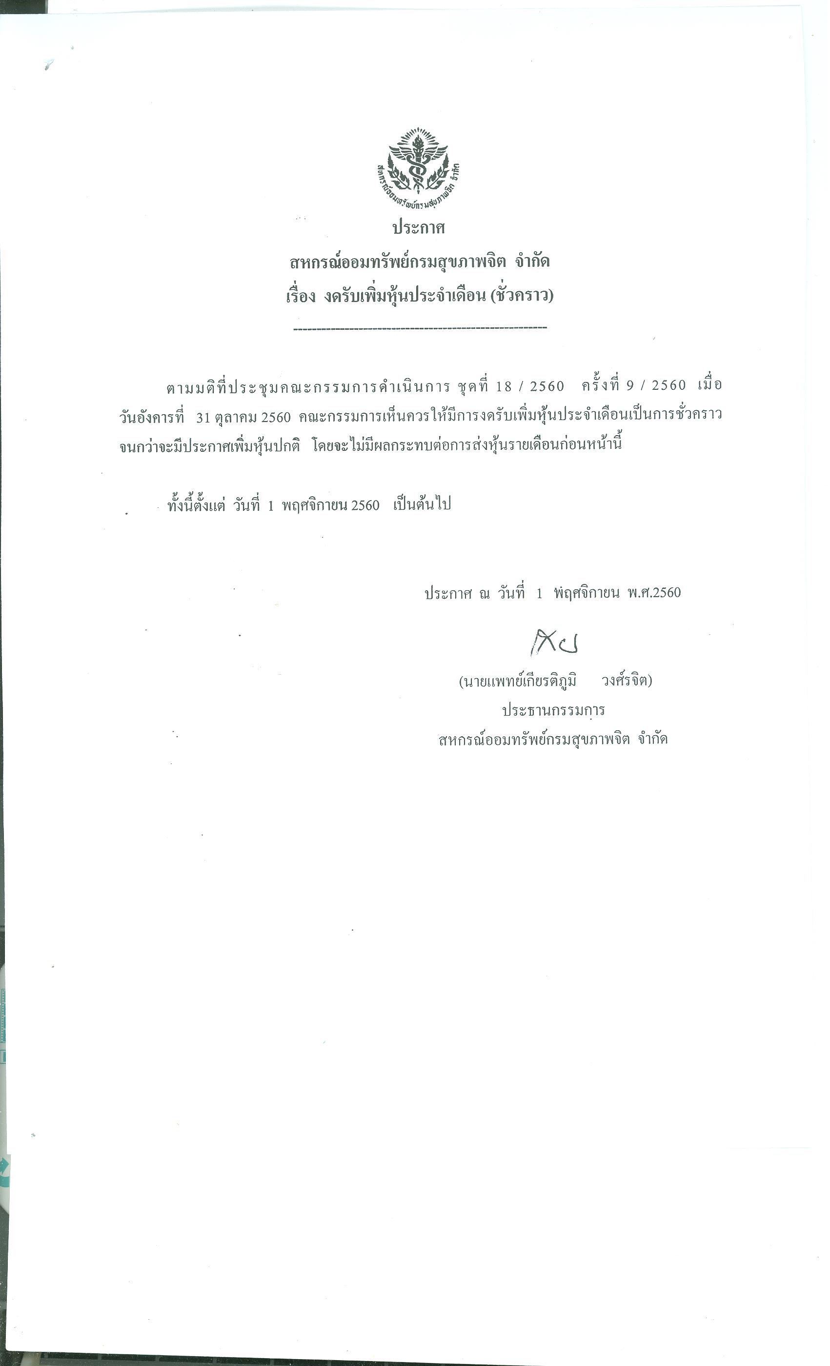 | เรื่อง | ประกาศเรื่อง งดรับเพิ่มหุ้นประจำเดือน (ชั่วคราว) ประกาศ ณ วันที่ 1 พ.ย.60 |