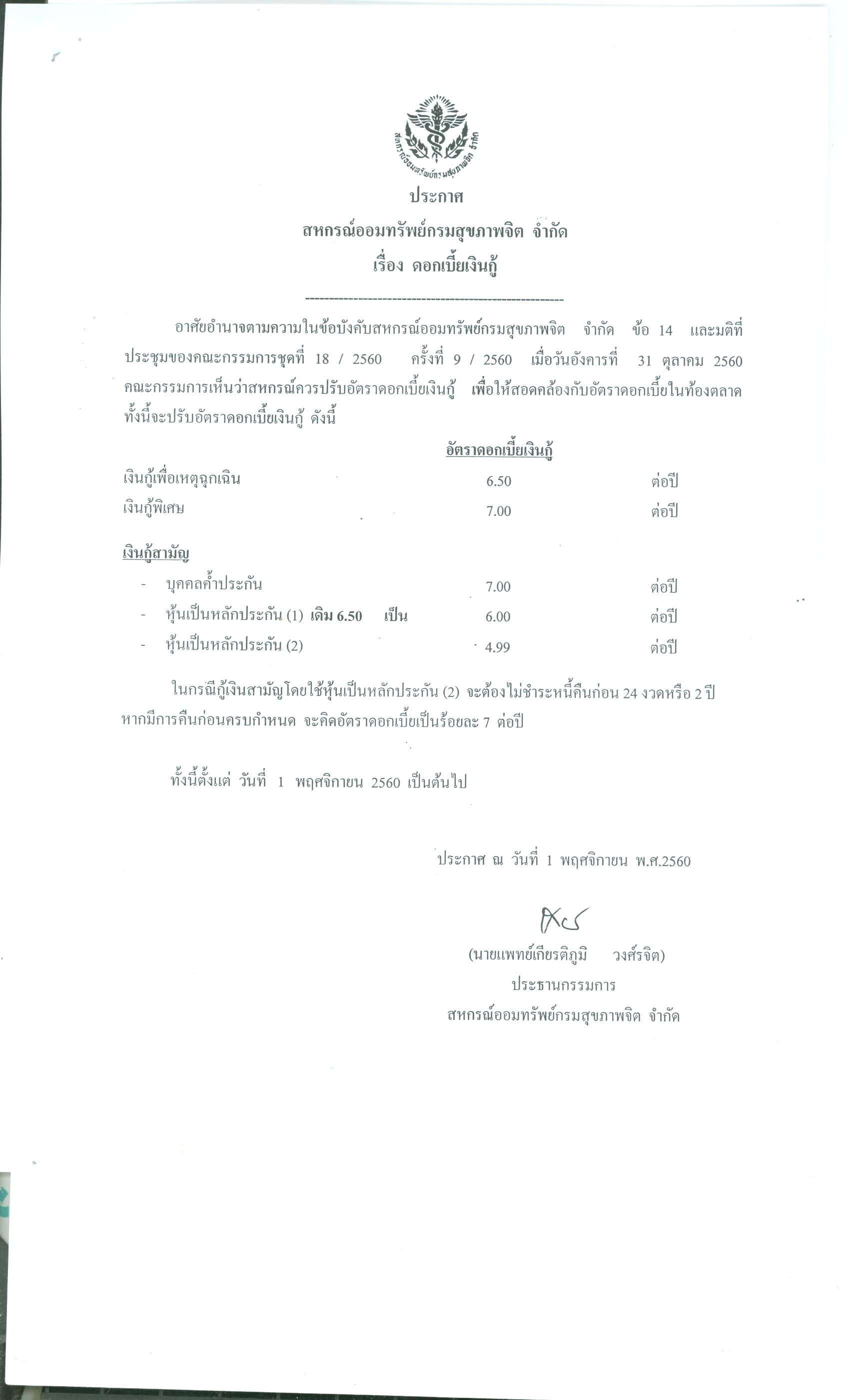 ประกาศเรื่อง ดอกเบี้ยเงินกู้ ประกาศ ณ วันที่ 1 พ.ย.60