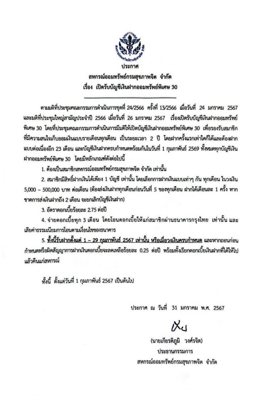 ประกาศสหกรณ์ออมทรัพย์กรมสุขภาพจิต จำกัด เรื่อง เปิดรับีเงินฝากออมทรัพย์พิเศษเล่ม 30 (ดอกเบี้ย 2.75%)