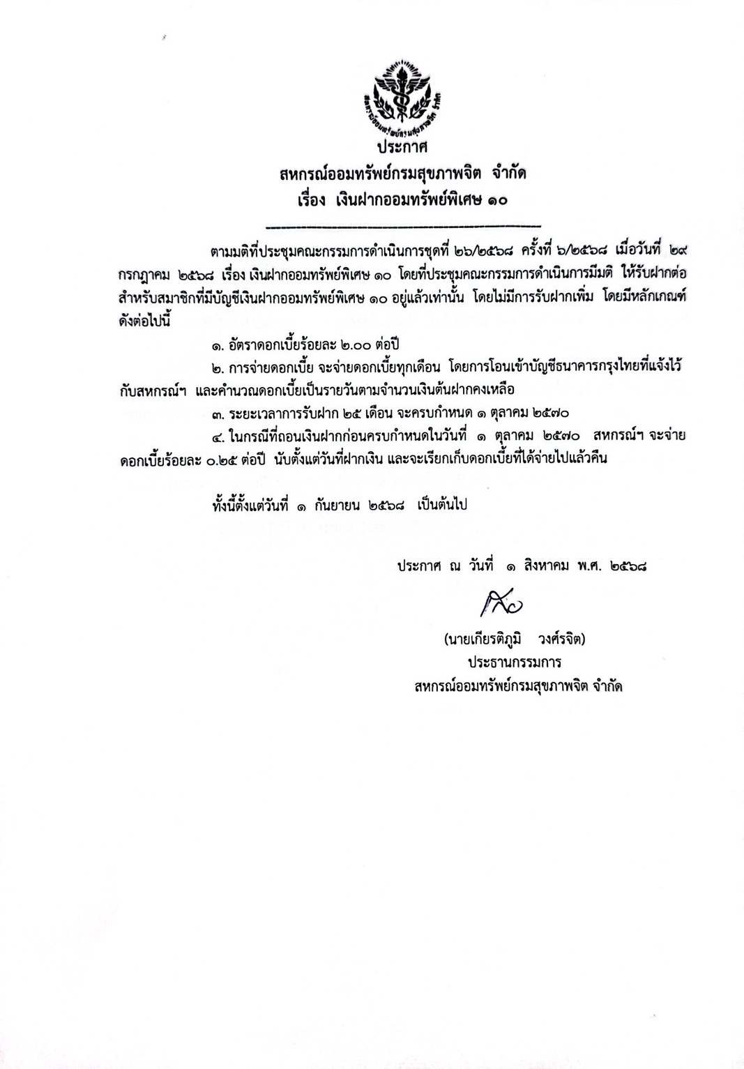 ประกาศ เรื่อง เงินฝากออมทรัพย์พิเศษ 10