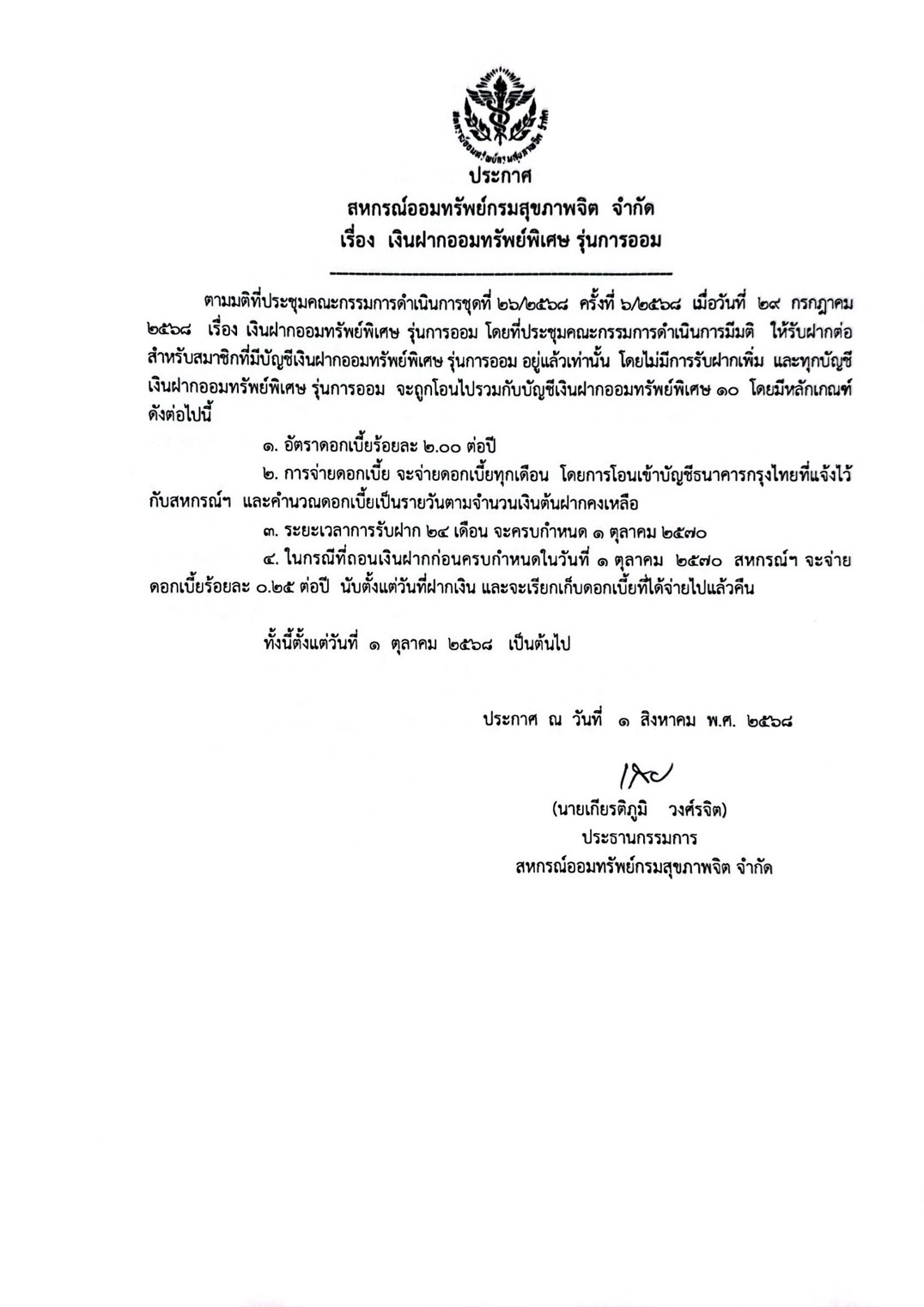 ประกาศ เรื่อง เงินฝากออมทรัพย์พิเศษ รุ่นการออม