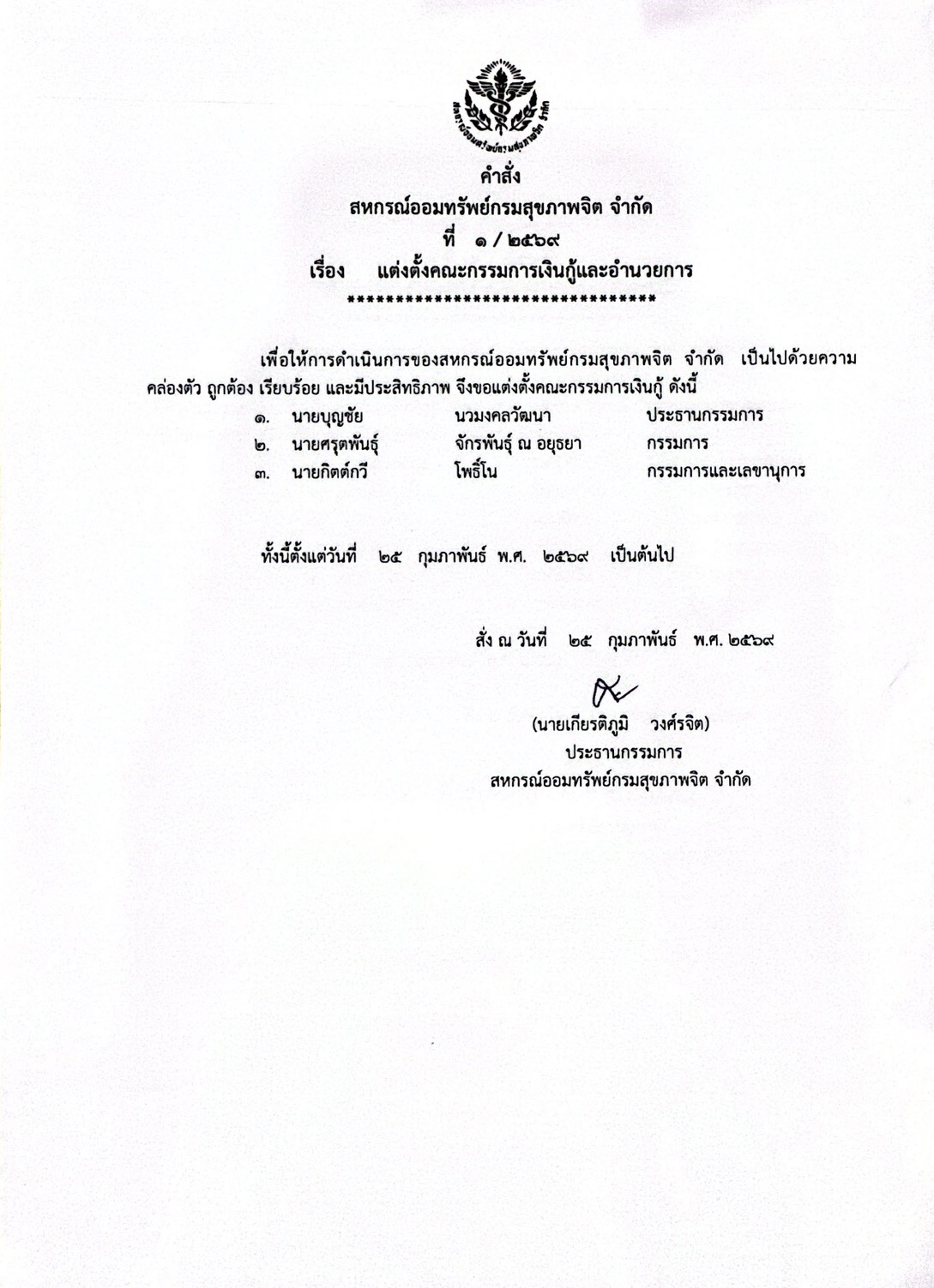 ประกาศสหกรณ์ออมทรัพย์กรมสุขภาพจิต จำกัด เรื่องแต่งตั้งคณะกรรมการเงินกู้และอำนวยการ