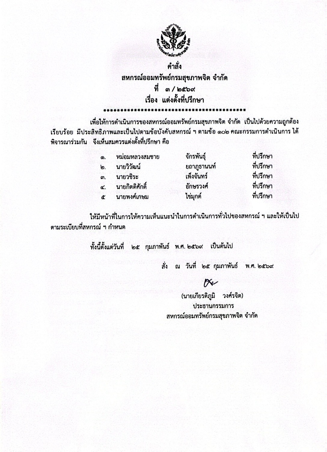 ประกาศสหกรณ์ออมทรัพย์กรมสุขภาพจิต จำกัด เรื่องแต่งตั้งที่ปรึกษา