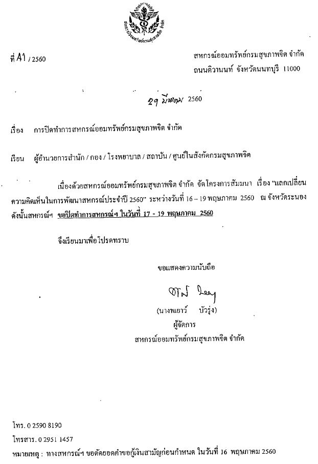 การปิดทำการสหกรณ์ออมทรัพย์กรมสุขภาพจิต จำกัด ในวันที่ 17-19 พฤษภาคม 2560 |